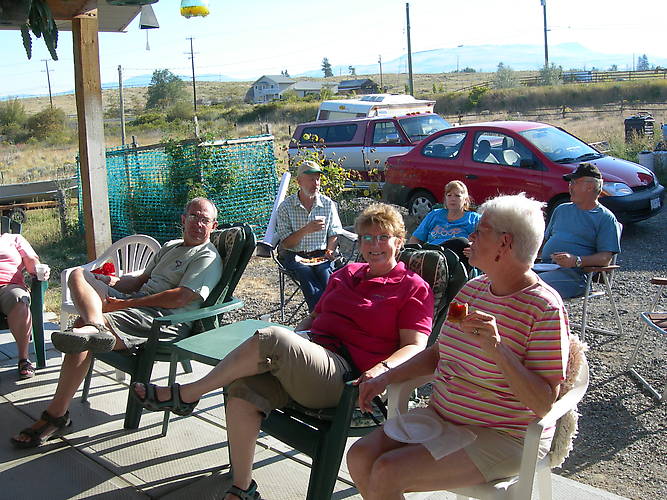 Front row, [L-R] Jack and Shelley Harynuk and Bev Scafe with her toast and homemade strawberry jam. mmm good! Back row [L-R] Jim Foulkes, Brenda, [creator of Larry the Lineman] and Aidan Morgan. The food was really good as proven by the fact when I finished taking the pictures, the food was nearly all gone. Then I found that Bev had made me a breakfast plate and put it in the oven to keep it warm. Thanks Honey. |