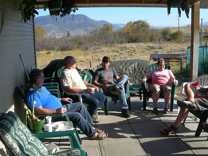 The rest of the Sunday morning breakfast bunch, [L-R] Reid Ryder, Dave Fleishman, Mark Schultz, and Marcia Ryder. Legs extreme right are courtesy of Jack Harynuk. [Sorry about that !!!] Mark Schultz has been collecting for several years, but this was his first time at the Insulator Ranch. Mark had a good time looking at all the displays, and on Sunday, Sept 27, made a return trip to visit us here in Merritt. Soon as Mark gets his computer hooked up, we'll get him onto ICON. |