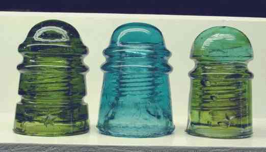 On left is a CD 113 Star in a dark yellow olive. Taken off a farmer line near Sprague, Wash. Center is a CD 120 PAT. APP. FOR . A very few of these were found in the Coeur d'Alene mining district of Idaho. Many were used in Nebraska. On right is a "shotgun skirt" Double Star with a skirt that is WAHOO! Mustard yellow-green, while the solid glass dome is blue-aqua with olive streaks. Just about awful, ain't it? This one came off a single ten pin arm line that ran through the big Ponderosa pines in NE Washington that was just full of these "shotguns", many were terrific mustard swirled, but this was by far the best! |