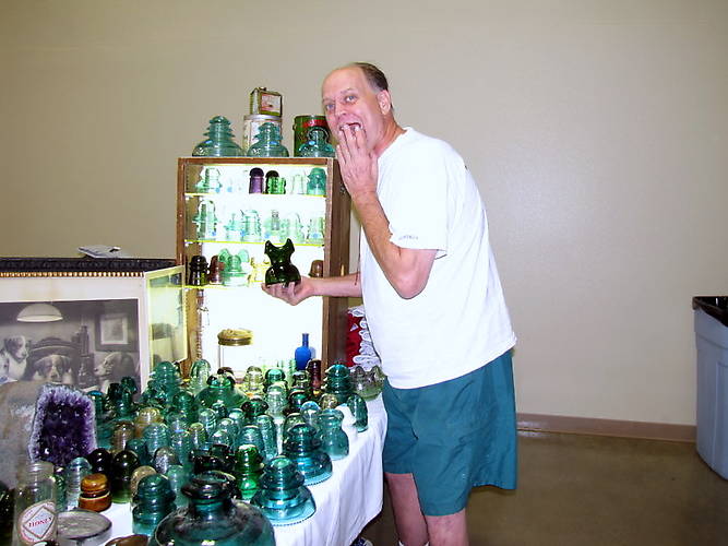 I forgot all about this one, exclaims Mike Bliss, of this nice Emerald Green No 3 CABLE. His comic relief is always a welcome part of this show. He knows more about the glass on his shelves than anyone I've met. Those power pieces on the top shelf are a real toughy to find in light aqua |