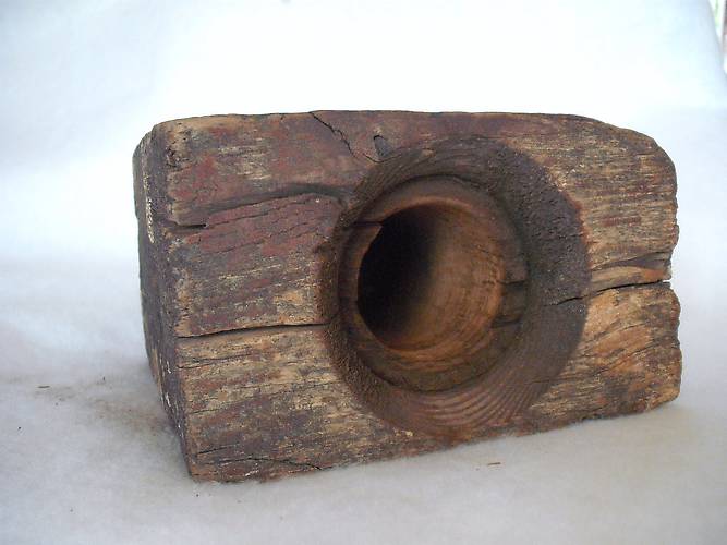I've removed the metal and glass horn to show the wooden block. I tried to show the threading inside the block. The metal case has threading on its exterior, and the wood has matching threading. Over the years the wood has dried out, making the once tight fit a bit loose. The wood has rings, and that is what you can see in the five o'clock to six o'clock position below the hole. That area is not threaded. Note too, the original red paint on the exterior up at the upper left. |