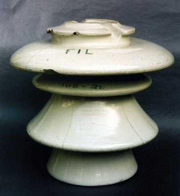 This insulator will be appreciated by power collectors. It is a large 4 parts manufactured in the mid Twenties by FIL, Fabbrica Isolatori Livorno (Leghorn Insulator Factory). All shells but the lower one are cracked, that means some flaw in the design or in cementing, but still an impressive piece, about 20 inches tall. [IFONA M] |