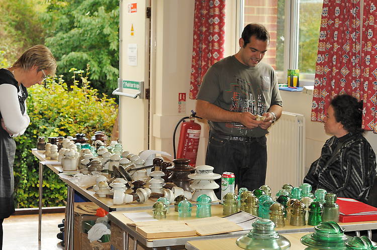 Here are the insulators from Miklos and Zoltan. Yannicks wife is taking a good look at them. We see Miklos and his girlfriend Violetta (correct name I hope). In the foreground is a fine variety of Romanian glass, also the short and stubby ones.