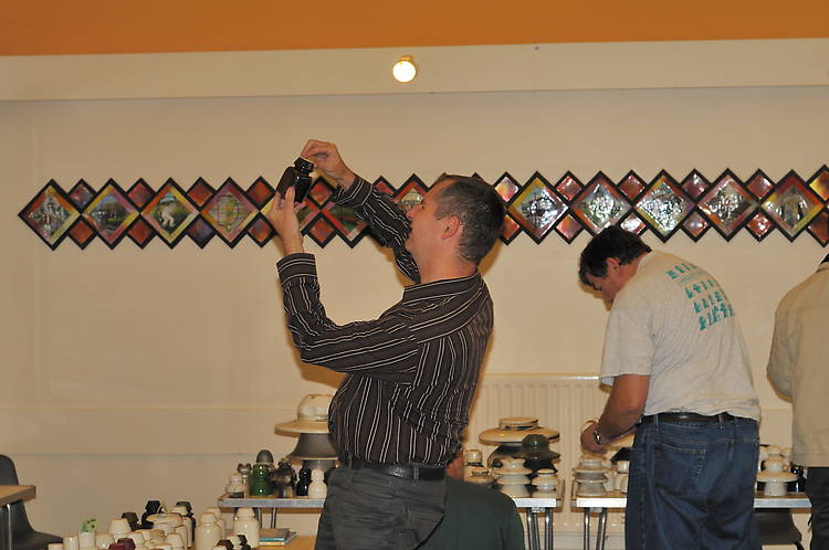 More admiring and looking at the Cordeaux pattern! Here Yannick taking a good look at a brown glazed Cordeaux. Rick is seen looking at Frantiseks insulators, looking for interesting stuff. The brown glazed ones with unglazed tops once were typical of the London, South Western Railway. They are often quite squat and stubby with an irridiscent hue to the glaze. Personally I got some from eBay UK some years ago, when I bought a box with 15 insulator from a bloke in south western England. He said they were found locally, which makes perfectly sense... |