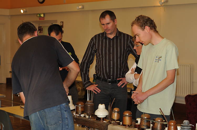 Gene is "demonstrating" some insulators, while Frederic, Yannick, Yannicks wife and James are paying good attention.