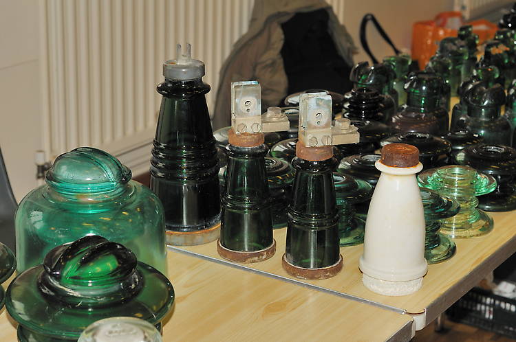 More insulators at Yannicks table; "bord de mer" fogtype, glass multis, spools and inside post insulators. The "bord de mer" was too heavy for me or to be more precise, to bring on the plane...otherwise I would have snagged one...! Maybe next year Yannick?? |