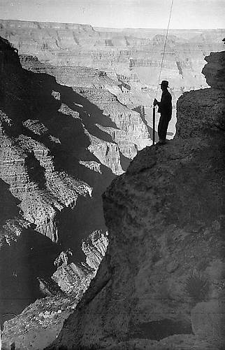 TRANS-CANYON TELEPHONE LINE CONSTRUCTION - SILHOUETTE OF CCC ENROLLEE ATTACHING WIRE TO POLE AT THE EDGE OF A STEEP CLIFF NEAR THE RIM. INNER CANYON BEYOND. CIRCA 1935. NPS PHOTO BY LAWS
