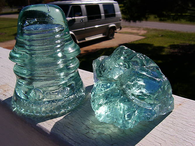 Here is a aqua chunk of Hemingray glass with a perfectly matching 151 that also has a neat bubble in it.