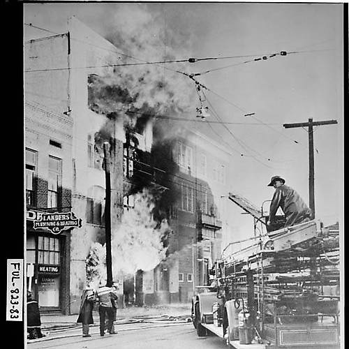 Hudson and Vittar Transfer Co. fire located at 227 Walton St. Fireman Arthur Lee Almand of ladder eight was electrocuted when his aerial ladder came in contact with trolley wires. From Georgia archives.