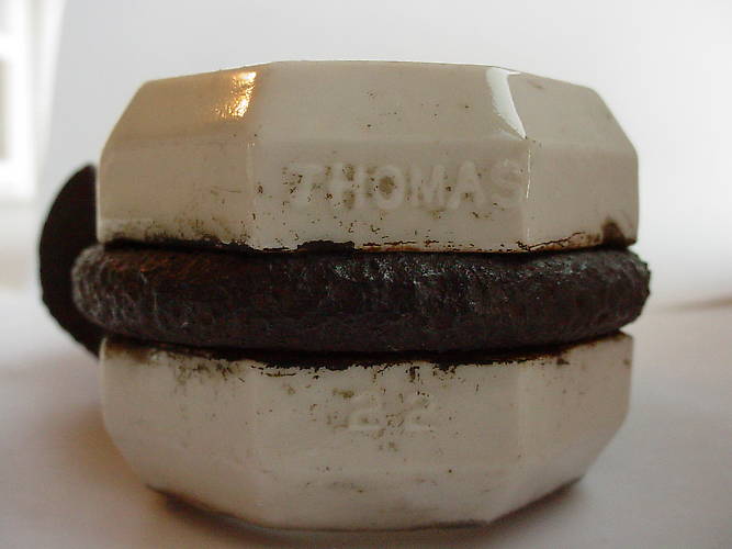 Embossed bottom of octogan shaped porcelain split insulator. Lou the pin man, know you have one or more, are they all embossed?