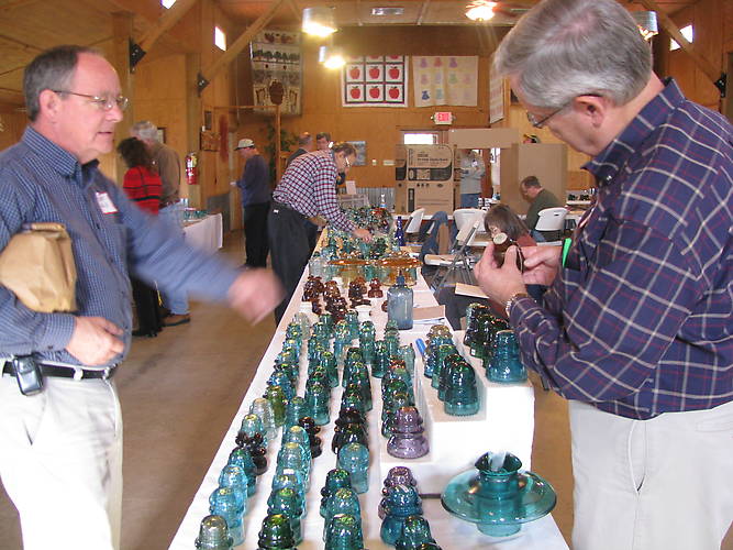 Two collectors looking at a foreign insulator. Look at all that glass on the tables in a row!
