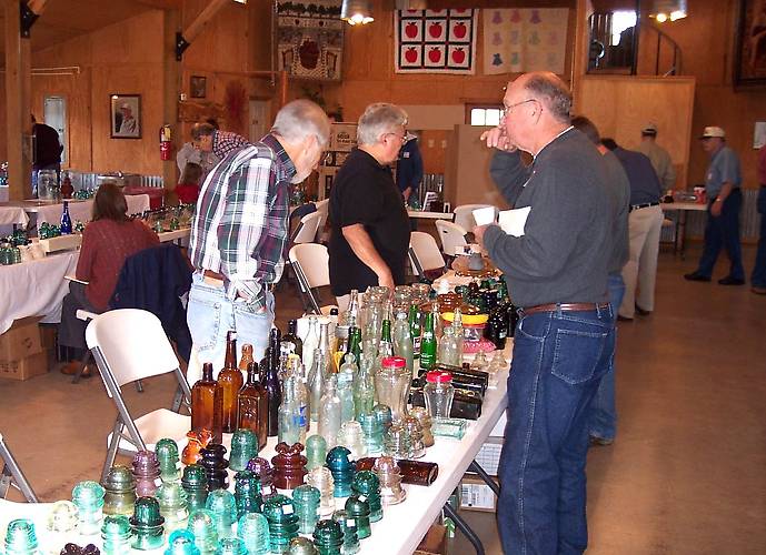 Gary Tilson is checking out Jim Scharnagel's nice sales stock of old bottles.
