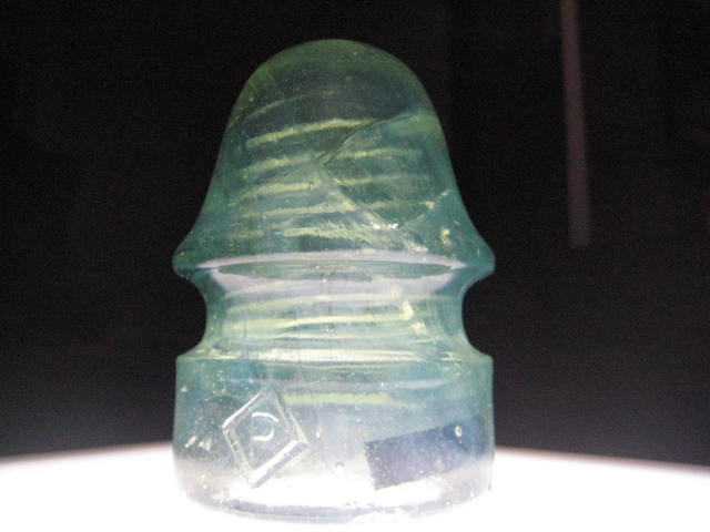 Here is another of my favorate insulators. This Diamond P shows the vaseline effect best when under lit. For charactor it also has several annealing lines cris crossing through the piece. A faboulus color