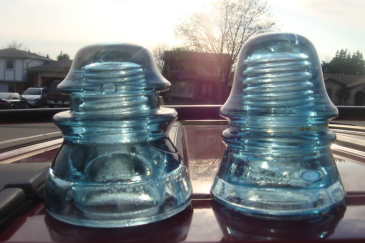 Happen to set this one down next my delft blue McLaughlin on the light rack and they matched. The next logical step was to take both out in the sunlight. Pic taken with sun behind the insulators. Anybody have a similar piece. Like to see the pic. Welcome comments. |