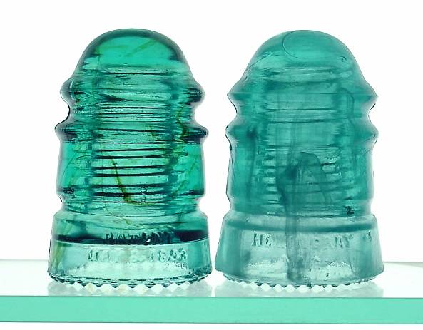 On left we see a tall dome variant in a pretty typical aqua base color, however the swirling of olive green stringers throughout gives it a rather interesting look. The glass is crystal clear, showing off the contrast nicely. On right is what many might call a "milky aqua", but careful examination reveals the "milk" is really more of a super fine veiling of micro-tiny bubbles, or as I prefer to call this, "steam". This one is the short dome variant. Note the differences in overall profile. This piece is much less crisply defined. Also note the tiny drip points on this one. |