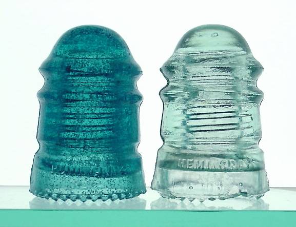 This pair are both short dome variants. On left is a Hemi Blue color with just an amazing storm of round champagne bubbles in the glass. Between the bubbles, the glass is quite clear, making for an unsual brightness in the sparkle off the bubbles. On right is an underwhelming ice green color, but do not be fooled, finding one like this is rare, indeed. |