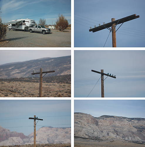 The discussion thread "who is watching you who are watching insulators" prompted me to post these pictures. Back in early November during our 7,000 mile Gurnee, IL - Santa Fe – Las Vegas – Grand Canyon – San Diego – Sequoia National Park – North Park, CO – Laramie – Cheyenne – back home – or bust tour, we spent the night at Vernal, UT. The next morning on the way to Walden, CO, I spotted a two-pair open wire line east of Vernal along side of and crossing US-40. I pulled the rig off the road and was merrily snapping pictures from the truck when a county sheriff's deputy stopped alongside and very politely asked if we were having a problem. When we assured him that we were fine, he smiled, waved, and drove off. This contrasts with our experience in Northern Ireland. In Derry (aka Londonderry if you are an Orangeman), I snapped pictures of insulators with no problem ([id=94086756] and [id=94086515]). However, our tour guide warned us NOT to take any pictures of the British guard towers. He'd had an earlier experience where a couple of SAS guys had emerged from a tower and confiscated cameras from tourists who, against advice, were taking pictures of the towers. By the time we were there in May of 2002, things were much more peaceful. It was still sobering to see the blast walls around the police station in Armagh and elsewhere. The first picture is our rig, parked in Vernal, UT. The rest were taken a few miles east of Vernal. This two-pair line crossed the road right where the second picture was taken. I was changing my camera lens when the sheriff's deputy briefly stopped. Several of the pictures show clear glass being used on one pair, and Hemi blue glass on the other. Wonder if this was because they were installed at different times? The blue-green insulators appear to be Hemi 42 CD 154s. I can't tell about drip points. The clear insulators have the shoulders of a CD 155. You can get an idea how rugged, desolate, and beautiful this country is by looking at the backgrounds. In the last picture, please note the line marching off into the distance, dwarfed by the hills. Just imagine the effort to build and maintain a line under these conditions! |