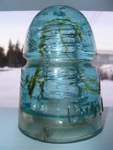 I call this piece "The Grim Reaper" because of the hooded character that is created by the amber swirling that travels around the whole insulator. I purchased this piece at an antique show in western Canada...with two other collectors in the building, sometimes you get lucky. |