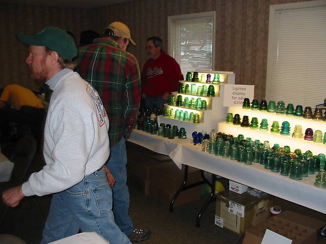 Here's Dan Ling bolting across the floor to make a deal. His table with a nice selection of glass and some porcelain is in the background. Dale Glendenning further to the right in background at his table. He also had some nice pieces as can be seen in the light box on his table. Included on it was a CD 113 'No Embossing'. |