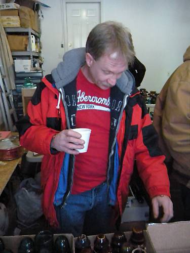 Jay Dondorf downs some hot liquids as the trading and sales warms up in the early morning.