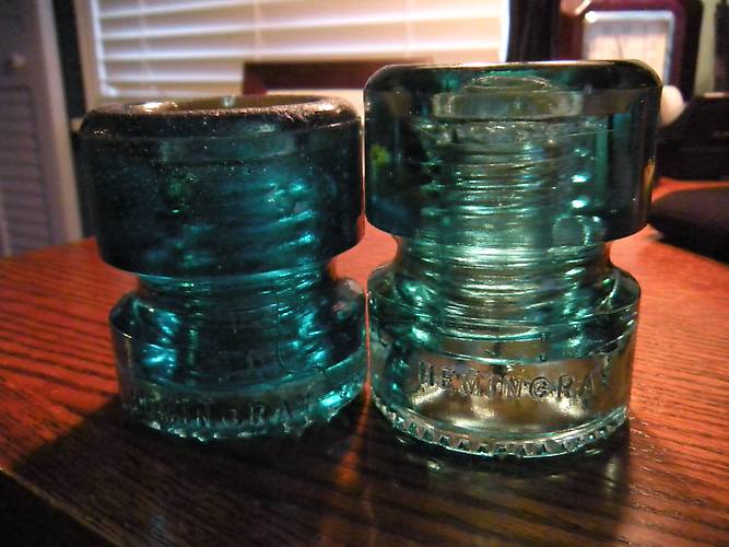 The CD 185 Hemingray Blue specimen on the left was purchased at the show from Gene Hawkins. It is next to a standard Hemingray aqua mine. Note the height difference. The embossing on the one on the left is very low; almost off the glass at the bottom. This was my major purchase at the show and I am so glad to add it to my shelves. Does anyone have a similar Hemi mine? I would be interested to know how many there might be. |