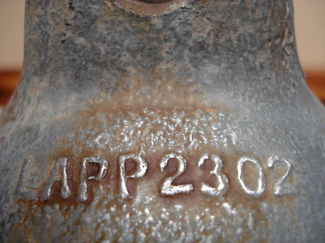 Here is a closeup of the embossing on the metal strap that was attached to the metal cap of this early Lapp suspension disc. It says: LAPP 2302. This was a nice test of the "macro" setting on my little Sony Cybershot (a great little camera).