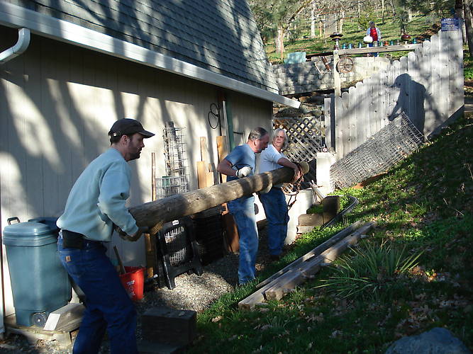 This is the first in a series of pictures taken shortly after the Feb JSIC swap concluded. Several collectors met up at my house for an old-fashioned "pole raising party!" Fellow JSIC collector Ken Klein gave me this pole a couple of years ago. It took me all this time to gather crossarms and hardware, dig the pole-hole, treat the base with wood preservative ... and gather sufficient manpower to lug the thing uphill to its new home. It was well worth the wait, as the next series of pictures shall demonstrate! Here is pic #1... as we lift the pole from its resting place. |