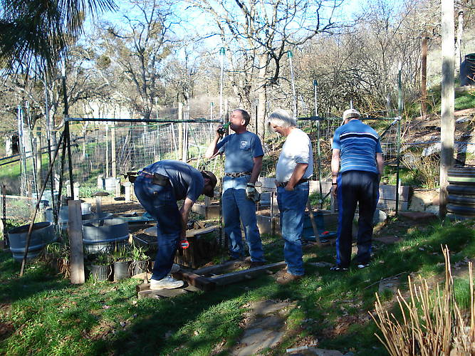 Here I am pre-drilling holes in the topmost 4-pin crossarm, in preparation to attach the metal braces. Meanwhile, Mid "braces" himself for the next step of the process with a bottle of Henry Weinhard's Blue Boar Ale.