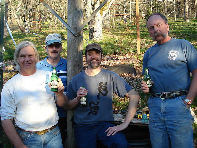 No pole raising is complete without a bevy of linemen in quiet repose, sipping adult beverages. Carl, Dale, and Mid, thank you for beautifying my yard (with the telephone pole).