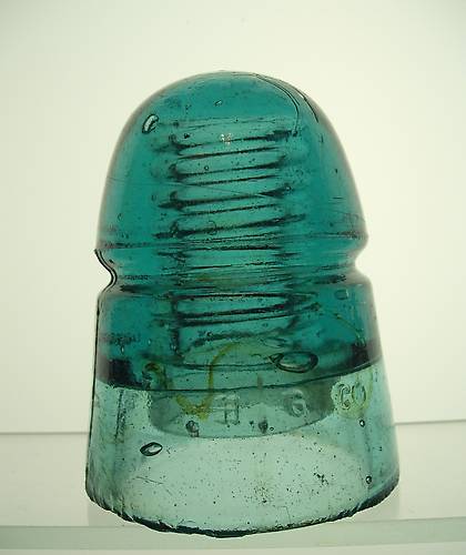 This is a CD 145 H G CO.EIN [010]. Yeah, one of those one dollar insulators in aqua. Fortunately, this one has some nice olive streaking behind the embossing. I like the small embossing that is widely spaced.