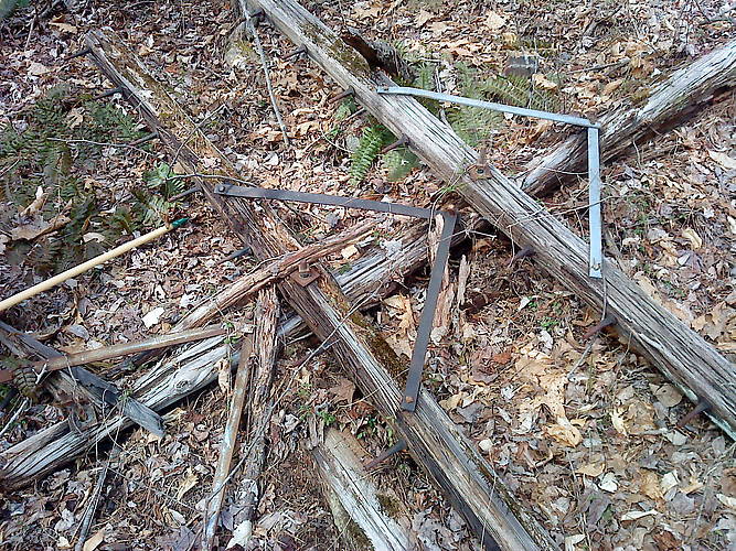 One of the poles on the ground With three crossarms. Where are all the insulators?