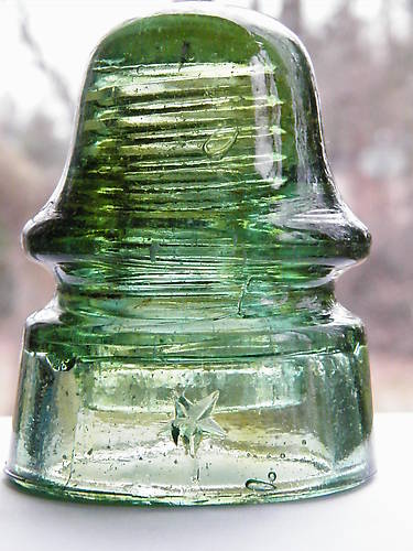 This insulator has an unlisted base color of light green with some very nice amber swirls. It also has many, many small pieces of junk. Have had many and seen many Star 162 signal since I've been collecting and this one is truely different from any others. Too bad my pic doesn't serve it the justice it deserves color wise. It arrived at my house today, shipped from Oregon. |