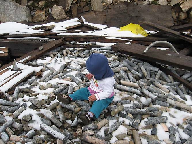 Here's Stella playing with all the "round rocks", drill core samples. Pretty cold up there for early September, still just slightly above freezing.