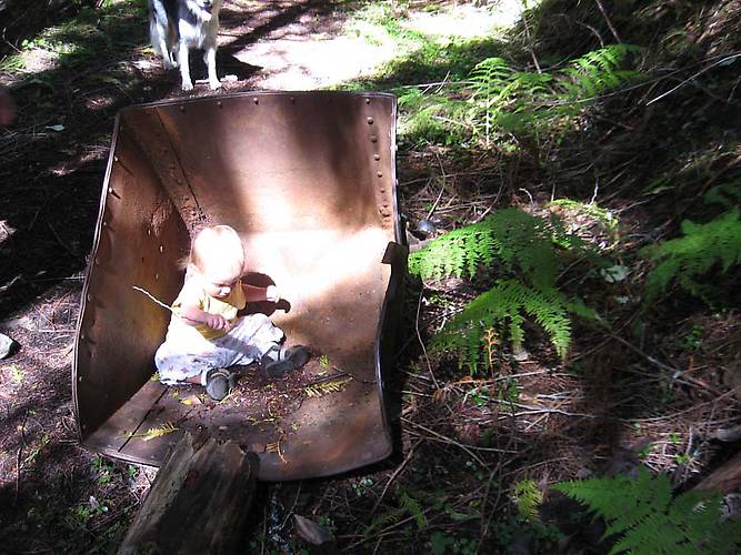 This mining operation had an aerial tramway that went right across the valley and up the other side of the mountain. There are ore carts and heavy cables throughout the bush. This was a good place to let Stella sit for a moment while snooping around. We hauled her along for this outing, she's used to going along on lots of backwoods adventures. We do bring a canister of bear-spray along with us. |