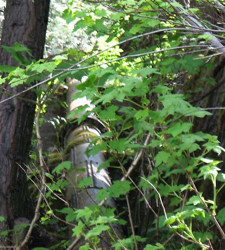 Here's the flume pipe entering the back of the station from uphill. This pre-dates electric welding, so it's all rivets on the piping. The intakes were 2 miles away! We didn't explore up the pipe to look for a communications/control circuit line. Lots of powerplants had a pole line up alongside the flume for the control of flood gates, etc. |