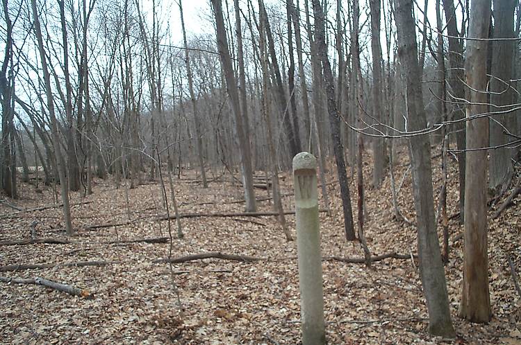 No train or trolley has passed this whistle marker in 70 years . The very long abandoned rail bed heads off into the distance
