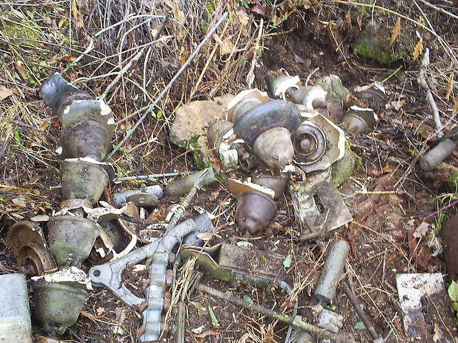 The rain let up for a few days so we decided to hunt a line close to home just to get out of the house. We ended up finding lots of broken OB suspensions and plenty of hardware. The suspensions were mostly 10" early patent dated with the early cap. We did find some larger disks we've not seen before. All in all a good day hunting. |