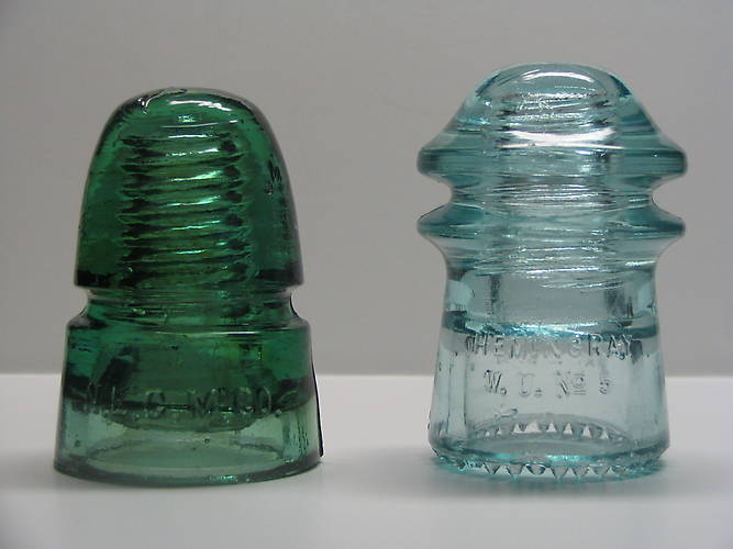 A CD 145 N.E.G.M.Co. in yellow green, and a CD 125 Hemingray W.U. No. 5 in ice blue.