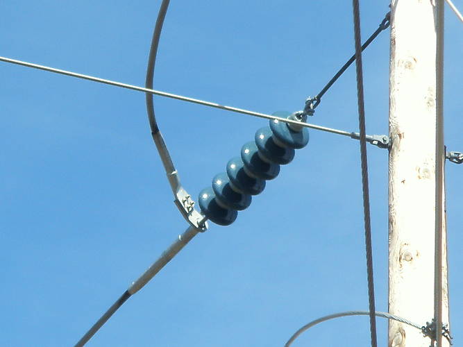 These blue suspensions were on the new hi voltage power lines beside the tracks. The poles are HUGE in diameter and about 80 ft tall. I am unable to put my arms around them and touch. There's at least 1 foot of space left keeping both my hands from meeting. I wish I had those suspensions! |