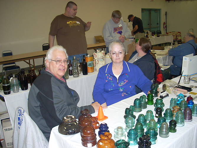 Jack and Linda Graham at the MVIC St Joseph show, 3/13/2010. They had all kinds of insulators and phone collectibles. In the background, it looks like Boone and Dave are busy examining the backs of their hands.