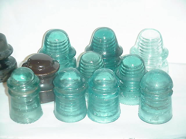 While visiting a friend (and fellow railroad item collector), i got a small box of insulators from him that he was planning on getting rid of. There were some good common ones in it including: Front row: CD 106 Hemi w. prisim lettering, 2 lt. blue aqua CD 106 OVG's, CD 102 Star Middle row: U-286 NN, 2, CD 160 H.G. CO.'s Back row: CD 162's: a Lynchburg, and Hemi 19's in dark Hemi blue and ice blue on the left side is a damaged U-302 NN in mottled charcoal/black. There was also another 106 OVG and 160 H.G. that were broken. |