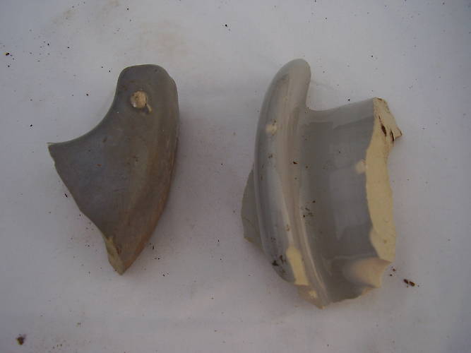 Here is the end of an aerial spacer and what appears to be the shard of a pin-type insulator. I don't know what insulator this would have come from but the porcelain is much thicker than the bushings we found that day.