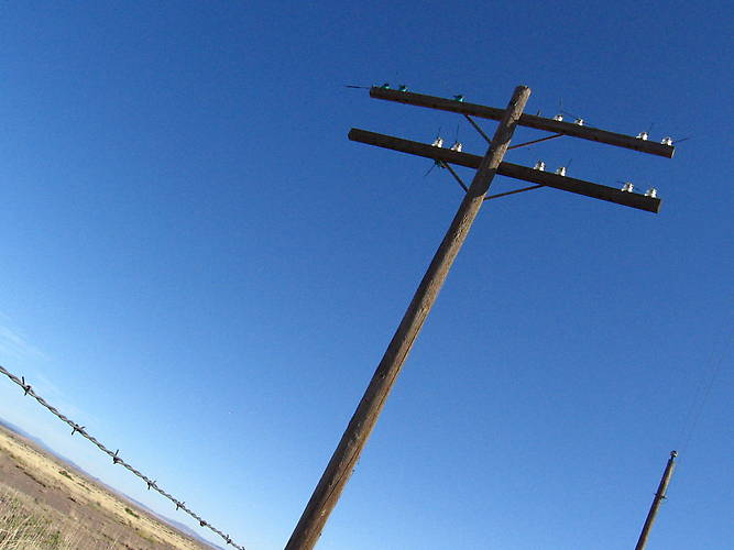Since I wasn't finding anything spectacular, I decide to cut my losses, turn around, and try another potential spot. This railroad was constructed in 1901, and the original telegraph line used aqua and purple 162 Denver products. My hope was to not only find the nice colored McLaughlins, but also a purple Denver. This is a 1920's to 1950's era open wire telephone lead that parallels the railroad. I thought it made a nice artsy shot. |