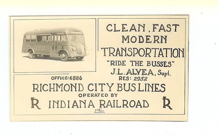 While digging thru old photos and negatives in my parents cedarchest, I came across this neat photo ad. This little photographic ad measures 1¾" x 3" and was included with your photos and negatives when you picked up your photofinishing. My parents married in 1939 and moved to Richmond, Ind. where dad was working for Postal Telegraph Co. Check out that fancy bus. In tiny print along the bottom of the piece it reads: E. HARLAN PHOTO AD / RICHMOND, IND Neat little advertising piece from the past. Photo collection of Timothy M. Baggett |