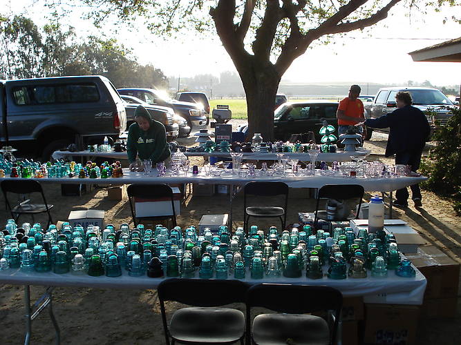 The annual Rohde swap is one of the very best insulator gatherings in the west. For several years now, Don, Camille, and Bill Rohde have combined efforts to host a truly amazing gathering of collectors at the country "ranch" a few miles north of Fresno. Some great glass and porcelain appears at this show. Collectors come from far and wide (including some from the East coast!). It's really the people that make this event special. This was my third time to attend this event. Ernie Carlson graciously provided his large diesel pickup truck for the journey, while Mid Norris and I helped with gas. The 8 hour drive from Oregon was well worth it. In this first picture, we see JoAnn Wood arranging purple glass sales stock in the early morning hours, while Mid Norris (orange shirt) looks on in the background. The morning started out chilly and damp. But soon the sun warmed up, and the show was on! |
