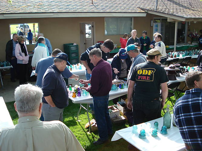 In the center of this picture, we see Bill Heitkotter (left) and Steve Marsh (right) examining an insulator. Bill Ostrander made a brief appearance at this show (wearing the ODF Fire shirt). Bill Ostrander was on his way to a colleague's retirement party in Arizona. Bill lamented the fact that three colleagues have retired, and each one of them held their retirement party on the same date as a major insulator show. When Bill retires, his retirement party should BE an insulator show! |