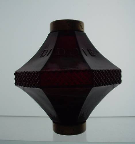 This wonderful deep red glass LRB is in the Diddie Blitzen Pattern. The ball is embossed on the top panels: DIDDIE BLITZEN RODS. The L.F. Diddie Company offered this pattern. The 'Blitzen' part is German for Lightning. This LRB stands 4 1/8 inches tall. Very nice ball! |