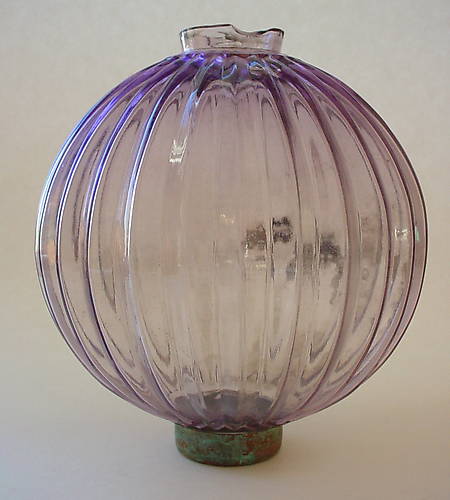 This is a 5 1/2" pleated ball embossed around top hole only: PAT D JULY 3RD 77 Guess these are hard to find. I'm lucky to know and call Mark and Elaine Corriero good friends. They found two of these at an antique store during one of the Springfield shows. Thanks again you two, for my favorite Lightning Rod Ball! |
