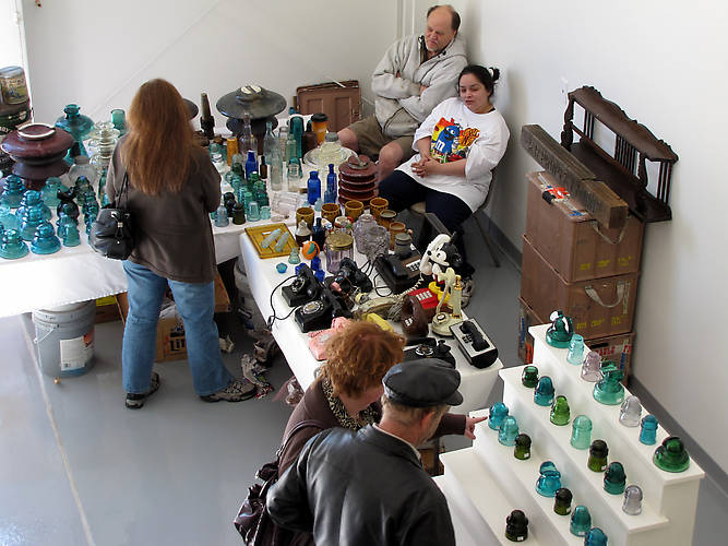 Mike Bliss & mona Ortez with a table full of all kinds of glass, porcelain & go-withs