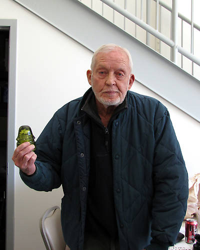 Larry McClain holding a CD 134 AM INS CO in yellow olive green that he plucked off a Colorado Springs house many years ago.